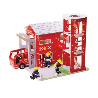 - Delightfully detailed wooden fire station features a firefighter’s pole, training tower with removable ladders, mezzanine for firefighters living quarters