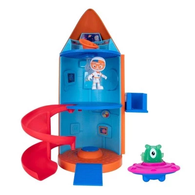 Get ready for an adventure of cosmic proportions with the Blippi Rocket Ship! This 14-inch playset features an elevator that your child can use to move Blippi up and down the Rocket Ship. Add a 3-inch Blippi and alien figure to your Blippi collection. Wah hoo hoo – this intergalactic playset includes over ten Blippi sounds and phrases! Place Blippi on his command center chair and spin him around. Let Blippi’s alien friend take a stellar ride inside the UFO. Take the space rover around the Rocket Ship and plant your Blippi flag down for all to see. Defy gravity by placing Blippi on the claw so he looks like he’s floating in outer space! Then push him down the slide and start the fun all over again!