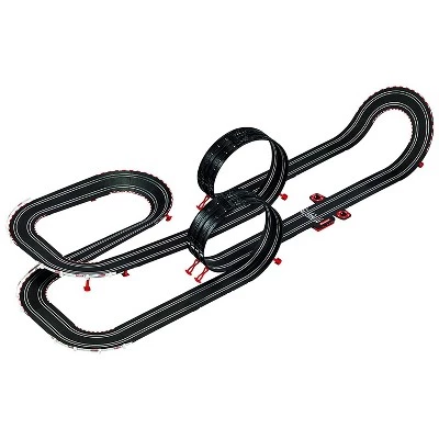 - Includes transformer, connection track, (2) speed controllers, (2) 1:43 scale cars, lap counter, straights, curves, supports, 2 loops, guardrails, and high-banked curves