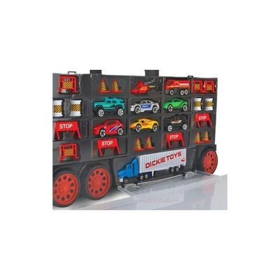 The Truck Carry Case Playset can hold up to 42 cars and doubles as a freewheeling vehicle. This detailed set features 7 die-cast cars, a helicopter, a big rig, and 18 accessories. Realistic construction accessories include orange traffic cones, construction barrels, construction barriers, and Stop barriers. Take playtime on the go with a carry handle included for easy transport. Suitable for ages 3 and up. WARNING: CHOKING HAZARD — Small parts. Not for children under 3 yrs.