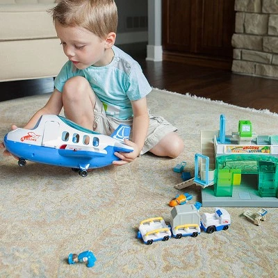 Send your little ones imagination soaring! From the ticket counter to the clouds, this beautiful play set is packed with all kinds of realistic details that turn the entire airport experience into a wonderfully open-ended play time adventure. Press the clerk at the ticket counter into their seat to hear them speak – Enjoy your flight! – and then load the luggage onto the carousel and turn the dial to send it sliding around to the back. Inside, theres another button in the floor kids can push for more words of welcome as they move to the yellow seats where they can wait for their flight to arrive. Upstairs theres a special scanner for checking their carryons while the staircase on the side pivots out for access to the tarmac. Its finally time to fly! Open up the side door of the included airplane and fold down the stairs to begin boarding. Upon entrance, a button on the floor welcomes little ones aboard as they make their way to their reclining seats. More buttons in the floor present messages from the flight attendants while another button in the captains seat lets the captain speak to the passengers. And all the while… Down below, an airport worker has arrived in a luggage carrier with two carts of luggage in tow – Open up the cargo hatch to load it all onto the plane! Brimming with fascinating details, exciting sounds, and all the accessories your little one needs to bring it all to life, the Airport Playset is sure to inspire hours of enlightening pretend play. Airport Playset Detailed airport pretend-play set featuring detailed accessories, lights, and sounds Encourages fine motor skills, imaginative play, storytelling, role-play, creativity Press clerk at ticket booth for fun music and encouraging message Press floor button for a welcoming message – Departures screen lights up Turn dial to spin the luggage carousel Wait in the waiting area for flight to arrive – Go upstairs to have your luggage checked Side staircase pivots out for boarding Also features air traffic control tower Airplane features opening side door with fold-out stairs, opening roof for easy access to interior, 4 reclining seats Captains chair features button for airplane sounds and messages from the captain Floor features buttons for messages from the flight attendant Hatch opens underneath plane for loading luggage Luggage carrier features 2 removable carts Includes airport, airplane, luggage carrier with 2 carts, large cargo container, 2 suitcases, personal luggage cart, 6 play figures (captain, air traffic control officer, engineer, 2 passengers, ticket counter clerk) Airport requires 3 AAA batteries – Not included Airplane requires 2 AA batteries – Not included Airport measures 15.75 x 8.5 x 6.75 inches Airplane measures 14 x 11 x 7 inches Features switches for changing from English to Spanish High-quality design and materials, BPA-free, nontoxic – Exceptionally durable and safe