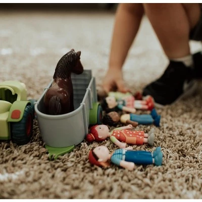 This sturdy green tractor/trailer combo is just what the Little Friends need to get to work! Whether they need to haul a horse, some hay or fresh picked veggies from the field, this truck is perfect! Featuring wheels that roll, and a trailer that is removable with functioning ramp that opens and closes. Collect all the Little Friends doll characters, animals and accessories. Compatible with all HABA Little Friends items.