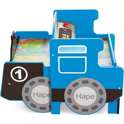 Gift your kid the ultimate multipurpose trainset. Equipped with fun sound effects and lots of accessories, this Hape Deluxe Full Wooden Ride On Foldable Engine Table is ideal for endless imaginative play.Designed for 2-in-1 fun, this train doubles as a train driving control board and game table. Now you can be an engine driver or enjoy moving the train around the track on the play table. The table comes packed with accessories including a push-along engine, carriages, small curved rails, Y-shaped rails, straight rails, a bridge, piers, trees, and a crane offering hours of imaginative play. The train has 4 kinds of lights and sound effects. Press the buttons on the train control board to hear alarm sounds. When done using, this set neatly packs away into the base of the foldable table to save space and teach children organization skills. Kids ages 3 and up will love the 2-in-1 train gift. See your child learn, grow, and enjoy quality playtime with the Hape Deluxe Full Wooden Ride On Engine Table from Hape. . . . .