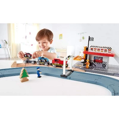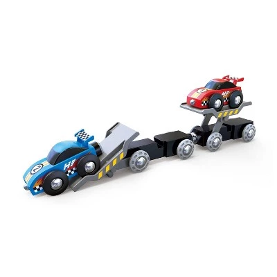 Hape Wooden 6 Piece Race Car Transporter Play Set with Foldable Ramps, Magnetic Couplers, and Driver Figurine for Kids Ages 3 and Up, Multicolor