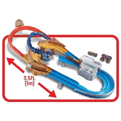 - Face-off against the mechanical scorpion in this monster truck stunt show-down for endless play; Comes with a Hot Wheels monster truck with giant rollers and a 1:64 scale Hot Wheels car