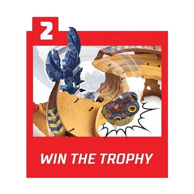 Amp up the stunting thrills with a high-stakes Hot Wheels Monster Truck battle for total domination. Kids will love facing off in the circular arena, where winners take the trophy, and losers get “devoured” by a deadly scorpion nemesis.Unleash imagination and storytelling play with an action-packed set that lets kids compete head-to-head in the ultimate showdown. Recommended for ages 3 and up, 1 lucky player will claim victory as everyone else becomes scorpion bait. As kids rev up their motor skills and embark on pulse-pounding stunt play challenges, timing and precision will be the main factors to earn a confidence-boosting win.To play, load up the 2 included Hot Wheels transports and slam launch them into smashing, crashing action. This monster truck playset features a 1:64 scale Hot Wheels car, a Hot Wheels monster truck, and a die-cast racetrack. This monster truck toy is recommended for kids ages 3 and up. Encourage kids to cope with frustrations when they arise, concentrate for extended periods of time, and develop strength and dexterity for better building with the Hot Wheels Monster Truck Scorpion Sting Raceway.