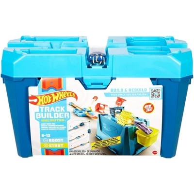 - ​The Hot Wheels Track Builder Stunt Crash Box is an explosive and thrilling all-in-one stunt box that includes 18 pieces with three unique stunting components and more than four different track configurations to let kids customize their builds