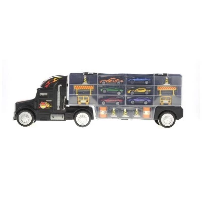 This 20” long transporter truck comes with 6 semi metal cars inside of it and can carry up to 28 small toy cars. Let the kids have fun taking all their cars to anywhere. The front of the truck can be detached, so it can turn. Playsets are great for kids to get social and an opportunity to use their wild imagination.Product names are trademark of listed manufacturer or other owners, and are not trademarks of eForCity Corp. The manufacturer does not necessarily endorse use of these products.