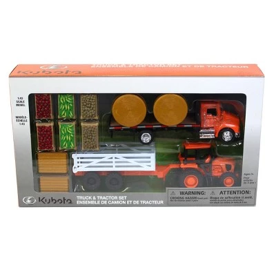 - Includes a tractor, truck, trailer, four bales (2 round and 2 square) and 6 crates