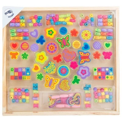 Young jewelers will really get their money’s worth! This diverse assortment of beads will impress jewelry lovers of all ages. Completely individualized bracelets or anklets can be made with the contents of this set. Whether butterflies or flowers, there’s a fitting motif for all tastes here. There’s no limit to creativity and fantasy with this set. The threading tools can be conveniently stored in the wooden box for transport. Who can craft the prettiest bracelet? Suitable for ages 3 years and up. WARNING: CHOKING HAZARD — Small parts. Not for children under 3 yrs.